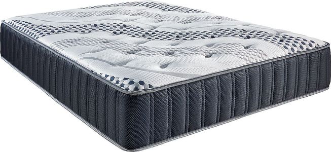 Tissu Wintry Wave rafraîchissant, 0,75 po (1,91 cm) de fibre en polyester, 1,5 po (3,81 cm) de mousse gel, 1 po (2,54 cm) de mousse miragel semi-souple, 0,5 po (1,27 cm) de mousse haute densité, 0,38 po (0,97 cm) de feutre isolant, ressorts ensachés à 5 zones dans un caisson en mousse