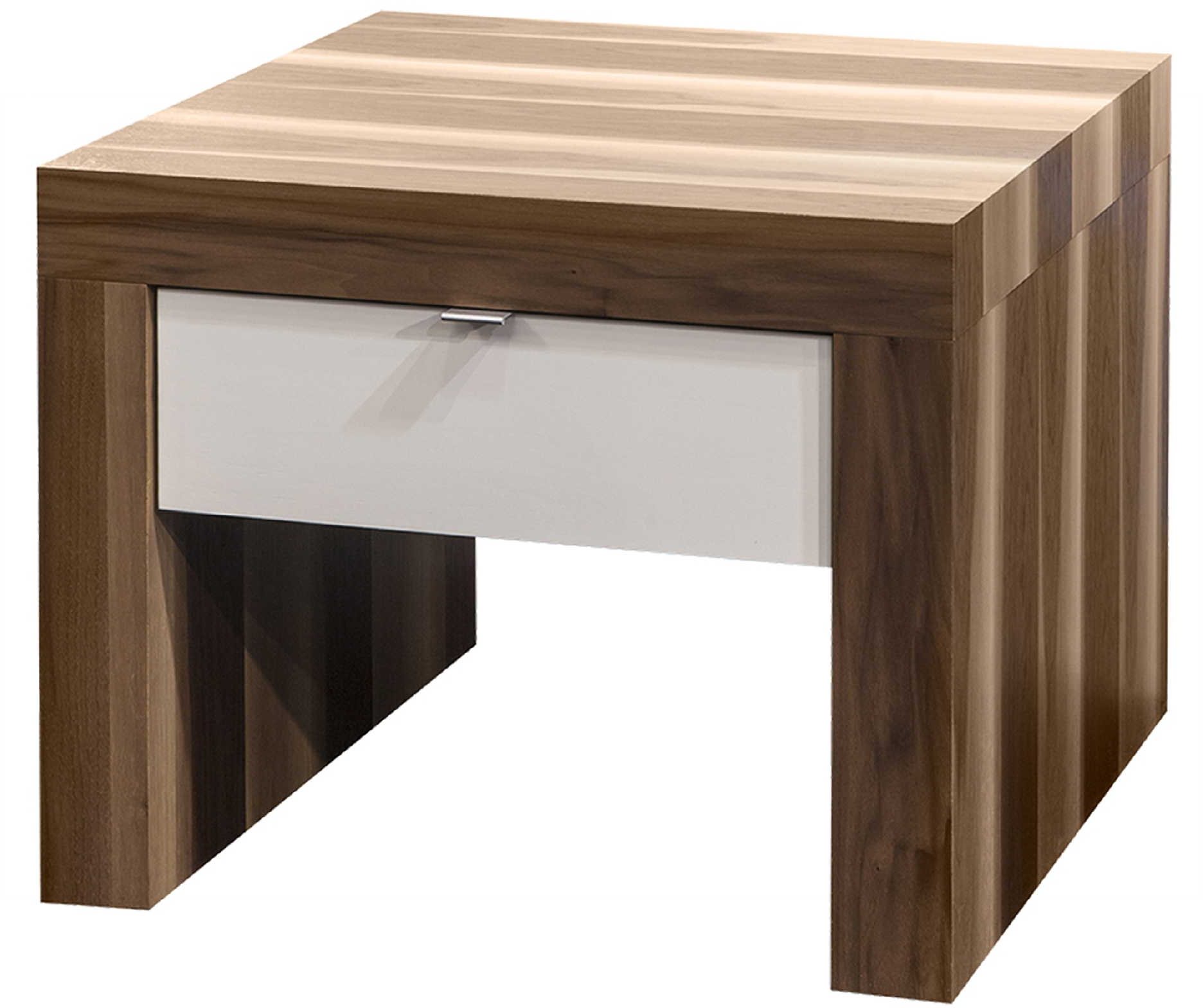 Cette table de bout carrée présente une finition en placage de noyer, un tiroir avec des coulisses "quadro" et elle est disponible dans plusieurs couleurs.Read More